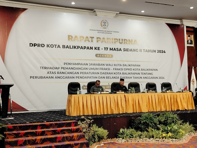 KOTAKU, BALIKPAPAN-Sekretaris Daerah (Sekda) Kota Balikpapan H Muhaimin menyampaikan jawaban Wali Kota Balikpapan terhadap pandangan umum Fraksi-Fraksi DPRD Kota Balikpapan atas Rancangan Peraturan Daerah (Raperda) Kota Balikpapan tentang Perubahan Anggaran Pendapatan dan Belanja Daerah (APBD) Tahun Anggaran (TA) 2024 dalam Rapat Paripurna yang dilaksanakan di Hotel Gran Senyiur Balikpapan, Rabu (21/8/2024).