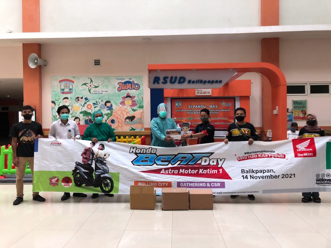 KOTAKU, BALIKPAPAN-Kebersamaan selalu merekat pada komunitas. Kegiatan seru kali ini Astra Motor Kaltim 1 bersama komunitas Beat menggelar kegiatan CSR, pemberian sarung tangan, masker, handsanitizer kepada para tenaga kesehatan di RSUD Beriman Balikpapan, Selasa (16/11/2021).