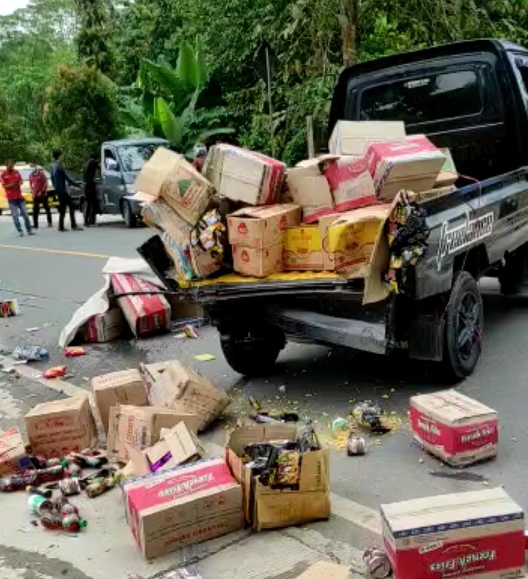 Rupanya selain menghantam pikap yang tengah bongkar muat, juga terlihat satu unit sepeda motor yang terjungkal di tepi jalan. Muatan berupa bahan sembako terlihat berhamburan di jalan. Sementara mobil Daihatsu