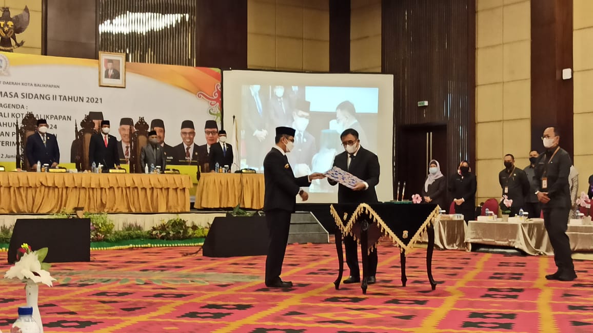 KOTAKU, BALIKPAPAN-Dewan Perwakilan Rakyat Daerah (DPRD) Kota Balikpapan menggelar Rapat Paripurna dengan agenda penyerahan memori serah terima jabatan wali kota sebelumnya HM Rizal Effendi kepada wali kota yang baru dilantik yakni H Rahmad Mas’ud di Ballroom Hotel Novotel, Rabu (2/6/2021).
