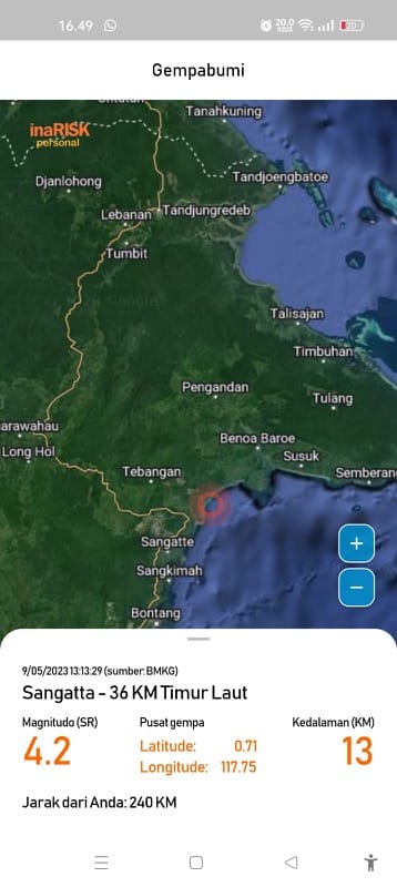 KOTAKU, BALIKPAPAN-Gempa bumi tektonik magnitudo 4,2 mengguncang kawasan Bengalon, Sangatta, Kalimantan Timur, Selasa (9/5/2023).