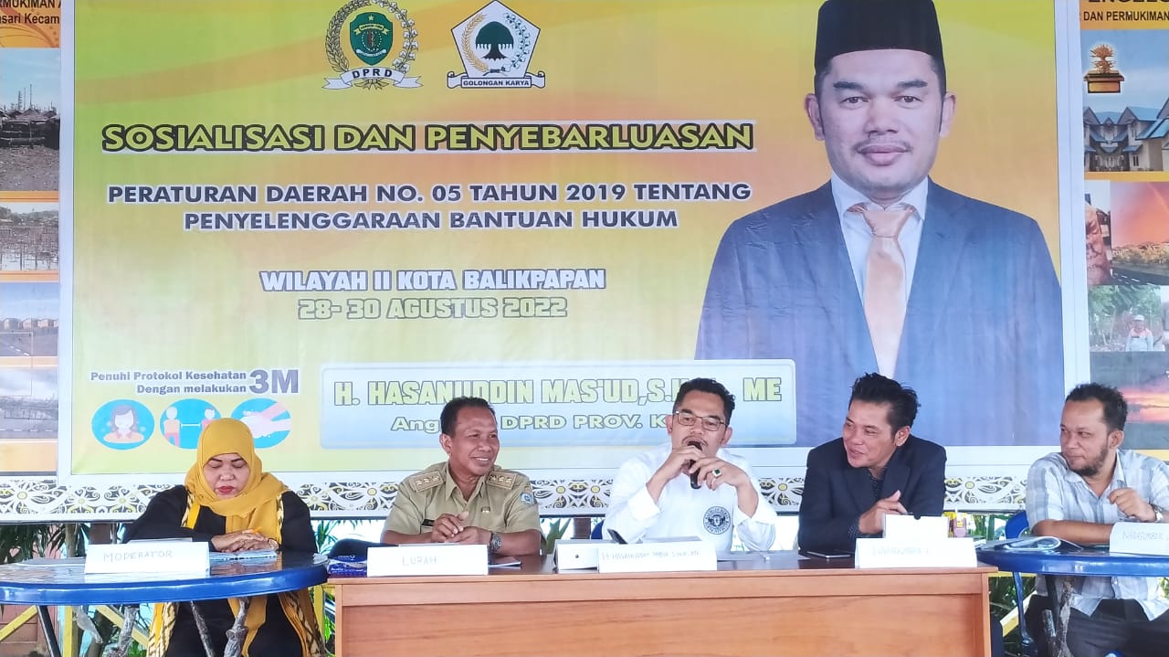 KOTAKU, BALIKPAPAN-Legislator Dewan Perwakilan Rakyat Daerah (DPRD) Provinsi Kaltim dari Daerah Pemilihan (Dapil) Balikpapan H Hasanuddin Mas’ud (Hamas) sosialisasi Peraturan Daerah (Perda) No 5 tahun 2019 tentang Bantuan Hukum bagi Masyarakat Kurang Mampu di Gazebo Kelurahan Margasari, Senin (29/8/2022).
