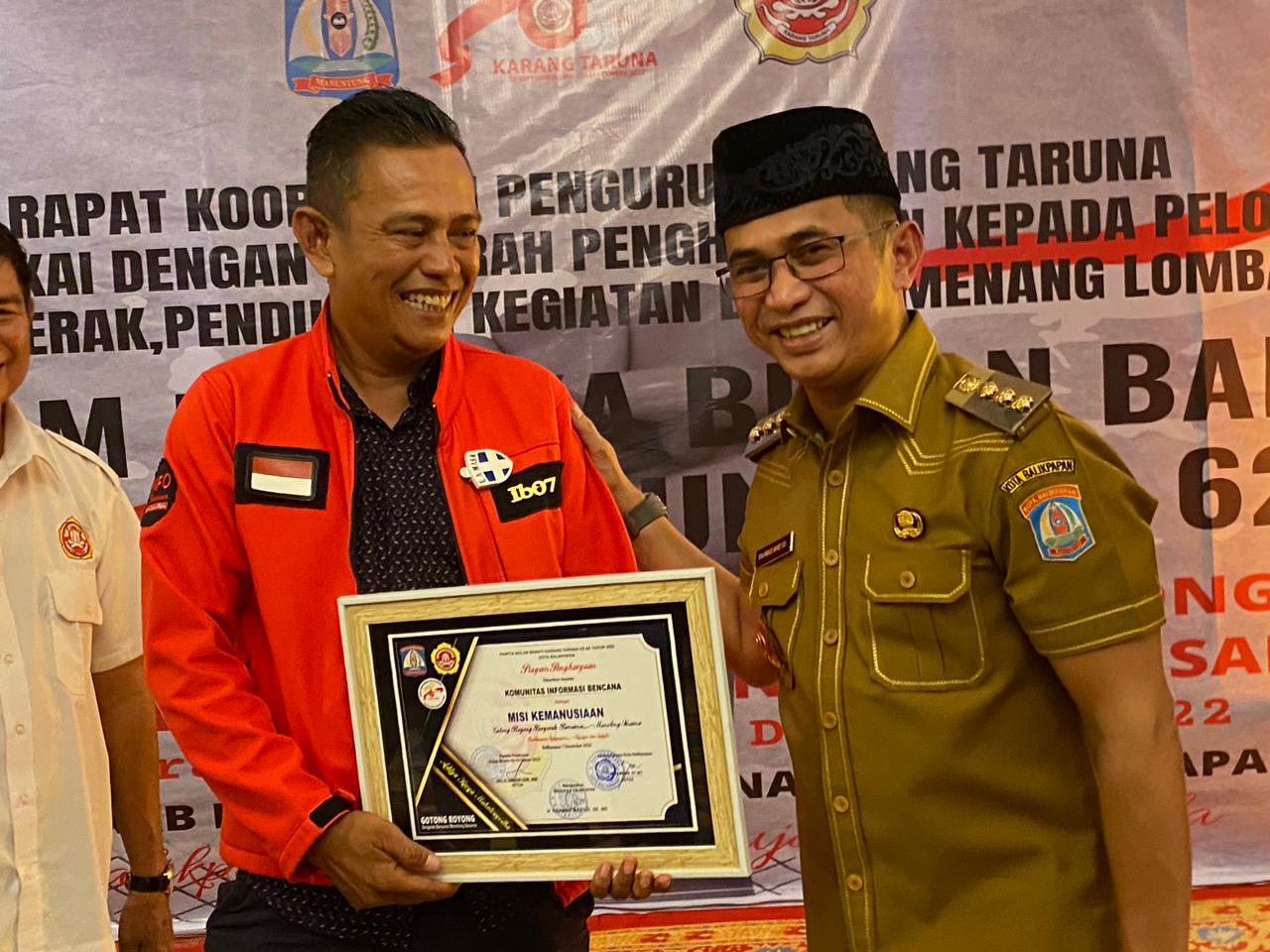 KOTAKU, BALIKPAPAN-Info Bencana (IB) Balikpapan mendulang penghargaan dari Karang Taruna (Katar). Piagam penghargaan itu diserahkan langsung oleh Wali Kota Balikpapan H Rahmad Mas’ud, Senin (12/12/2022).