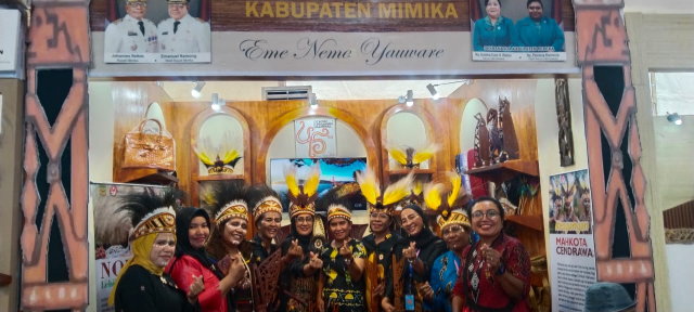 Belum lagi pakaian khas yang dikenakan para pengurus Dekranasda Mimika, lengkap dengan atribut seperti topi mahkota burung cendrawasih dan topi burung kaswari.