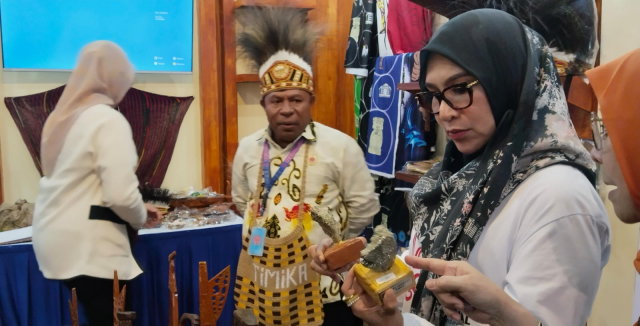 Selain menawarkan produk khas Bumi Cenderawasih, stan Dekranasda Mimika juga menarik perhatian pengunjung karena dekorasi etniknya yang unik dan fotogenik.