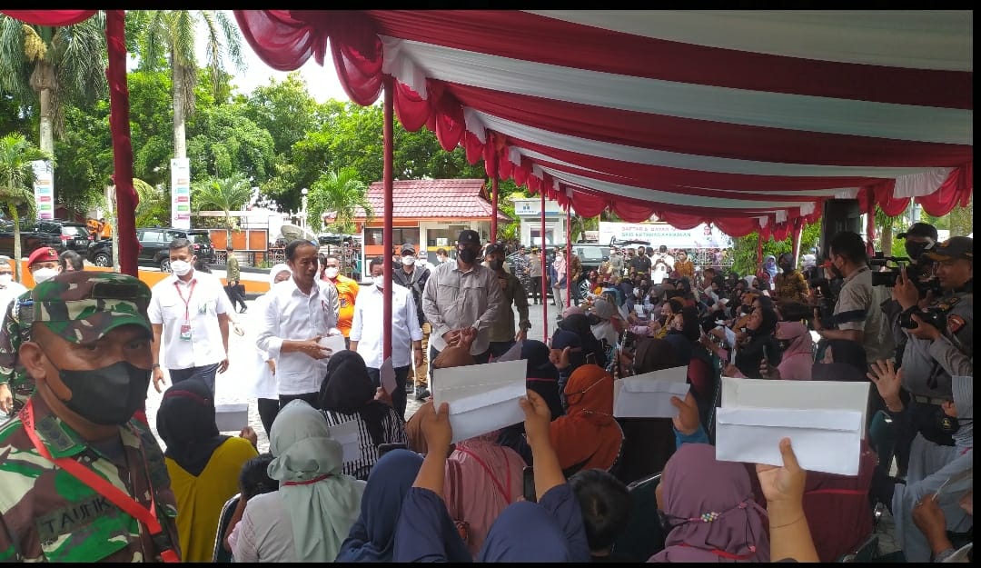 KOTAKU, BALIKPAPAN-Sejumlah penerima bantuan langsung tunai (BLT) masing-masing Bantuan Subsidi Upah (BSU) untuk pekerja tertentu dari Kementerian Ketenagakerjaan (Kemenaker) dan BLT BBM untuk warga kurang mampu dari Kementerian Sosial (Kemensos) sejak pukul 08.00 Wita duduk rapi, mengisi tempat yang disediakan, di halaman kantor PT Pos Indonesia cabang Balikpapan Jalan Jenderal Sudirman, Selasa (25/10/2022). Para penerima bantuan tersebut menanti kedatangan Presiden RI Joko Widodo (Jokowi) untuk membagikan bantuan secara simbolis.