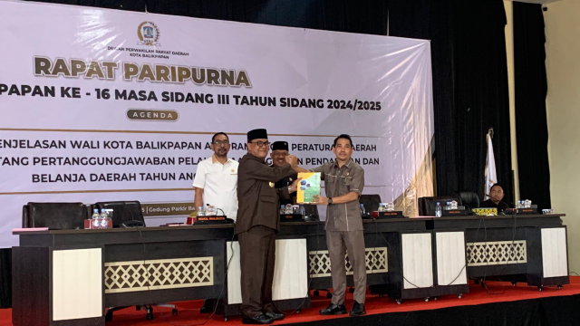 KOTAKU, BALIKPAPAN-Wakil Wali Kota (Wawali) Balikpapan DR H Bagus Susetyo menyampaikan laporan keterangan pertanggungjawaban (LKPj) atas pelaksanaan Anggaran Pendapatan dan Belanja Daerah (APBD) tahun 2024 dalam rapat paripurna di Gedung Parkir Klandasan, Senin (23/6/2025).