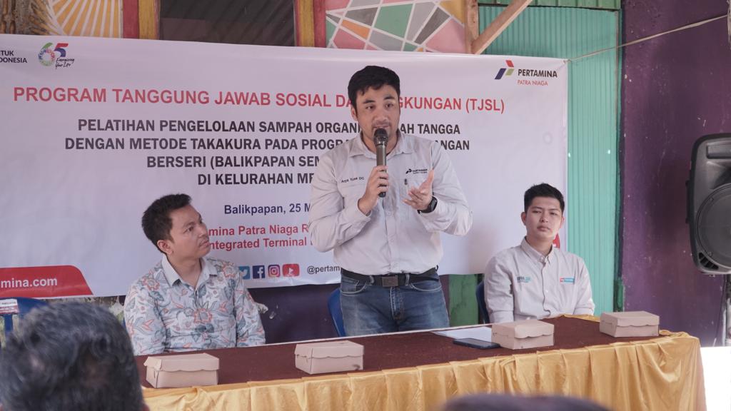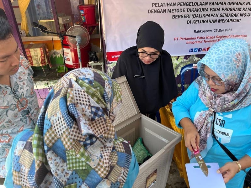 KOTAKU, BALIKPAPAN-PT Pertamina Patra Niaga Regional Kalimantan latih warga Kelurahan Mekarsari mengelola sampah organik rumah tangga dengan metode “takakura”.