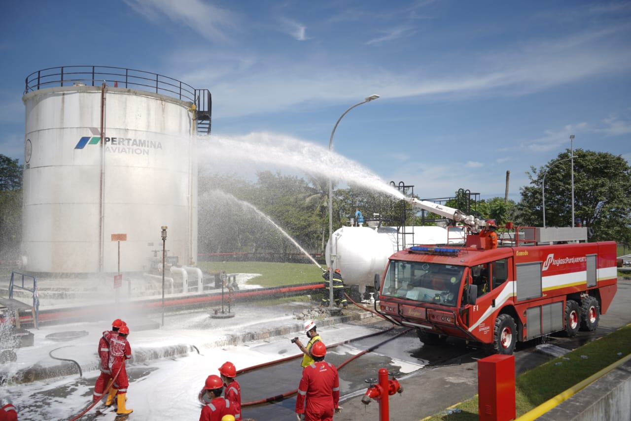 KOTAKU, BALIKPAPAN-Pertamina Patra Niaga Regional Kalimantan mengadakan simulasi keadaan darurat di Depot Pengisian Pesawat Udara (DPPU) Sepinggan, Senin (17/10/2022). Simulasi kejadian merupakan level 1 yang melibatkan kepolisian, Badan Penangggulangan Bencana Daerah (BPBD), Rumah Sakit Pertamina, Pemadam Kebakaran Kota Balikpapan, Airnav, Airport Rescue and Fire Fighting (ARFF), Tim Penanggulangan Keadaan Darurat (TPKD) DPPU Sepinggan dan Tim HSSE Regional Kalimantan dan Pertamina Grup yang ada di Kalimantan.