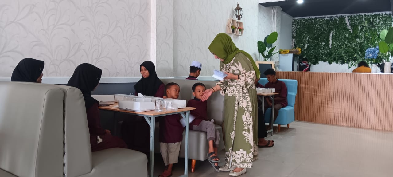 Kami tidak bisa hadir semua karena ada anak yang sekolah sore,” ujar Ustaz Adam, mendampingi anak-anak Panti Asuhan As Sakinah, ditemui di Jules Yoshino Cafe and Restaurant.