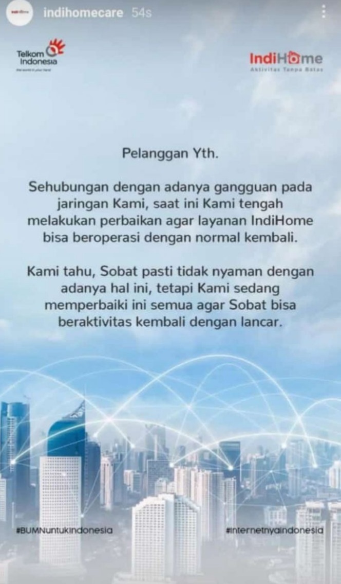 “Saat ini kami bersama TelkomGroup sedang berusaha untuk menemukenali penyebab gangguan, dan memprioritaskan percepatan pemulihan akses layanan internet di seluruh wilayah yang terdampak. Sedangkan, untuk layanan telpon dan SMS masih dapat diakses dengan normal,” jelasnya.