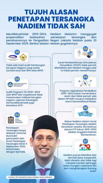 Kuasa hukum Nadiem yakni DR Dodi S Abdulkadir dalam siaran pers yang ddisampaikan kepada kotaku.co.id, Selasa (30/9/2025), menegaskan terdapat tujuh alasan utama yang membuat penetapan tersangka terhadap mantan Menteri Pendidikan, Kebudayaan, Riset, dan Teknologi tersebut dinilai tidak sah dan tidak mengikat secara hukum.