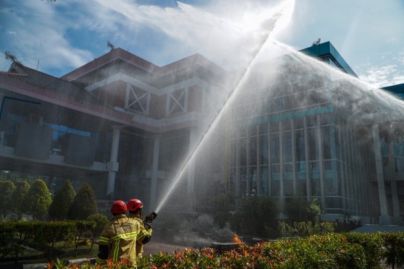 Dalam salah satu sesi, petugas pemadam kebakaran menunjukkan langsung cara menangani api dengan menggunakan selang air bertekanan tinggi ke arah gedung, menggambarkan skenario pemadaman api yang terjadi di lokasi kerja.