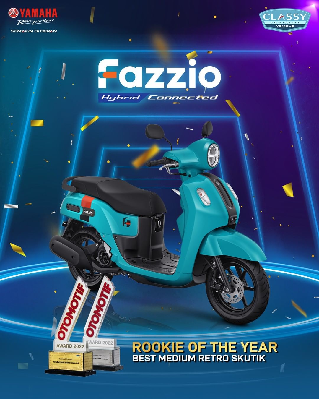 Dari hasil penilaian oleh dewan juri, motor kategori Classy Yamaha yaitu Fazzio Hybrid-Connected layak dinobatkan sebagai Rookie of The Year. Pendatang baru yang menjadi kejutan besar dunia otomotif roda dua Tanah Air awal tahun 2022 tersebut, mampu menunjukkan prestasi cemerlang seiring booming motor ini di market Indonesia.