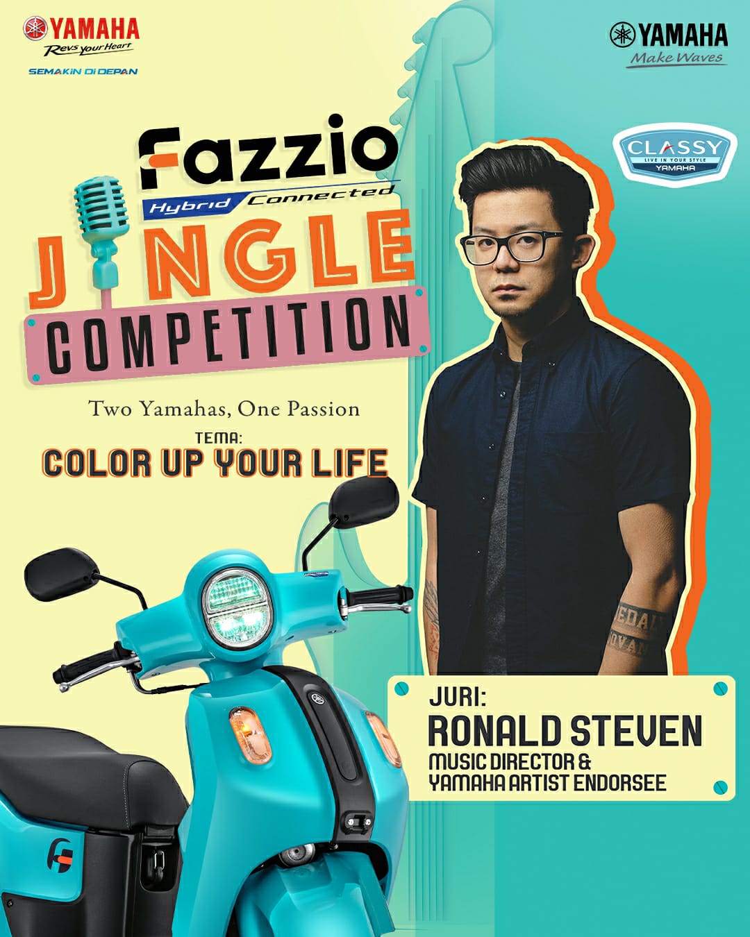 Dalam keterangan tertulis yang disampaikan, Kamis (28/4/2022) dijelaskan, Fazzio Jingle Competition berlandaskan semangat “Two Yamahas, One Passion”, antara PT Yamaha Indonesia Motor Manufacturing (PT YIMM) dengan PT Yamaha Musik Indonesia Distributor (PT YMID) . Mengangkat tema Color Up Your Life, Fazzio Jingle Competition ingin mengajak masyarakat Indonesia, khususnya anak muda dengan beragam karakter dan lifestyle untuk lebih positif dan semangat mewarnai hari, tahun 2022 melalui karya musik bersama produk Classy Yamaha.